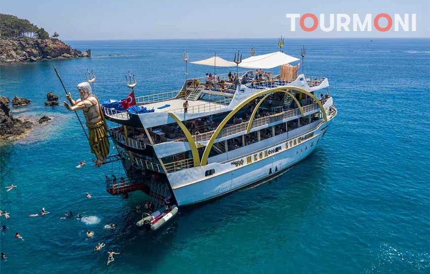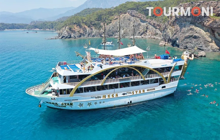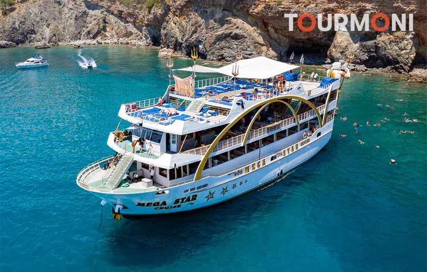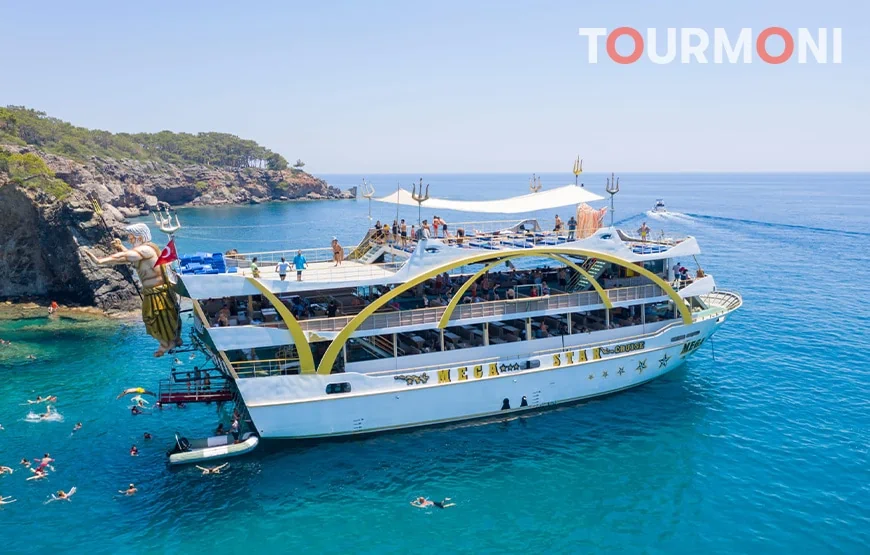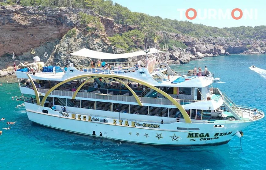 Entdecken Sie entzückende kleine Buchten entlang der Küste, während Sie auf einem prächtigen Boot über das türkisfarbene Mittelmeer fahren. Unsere Antalya Mega Star Bootsfahrt ist die beste Wahl für diejenigen, die Erholung, Vergnügen und Sightseeing kombinieren möchten. Schwimmen Sie in den klaren Gewässern von Olympos Cove, Porto Ceneviz und Phaselis, um sich zu entspannen. Wir laden Sie ein, bleibende Erinnerungen mit Ihren Lieben zu schaffen und dabei die gemeinsame Zeit auf unserer Bootstour auf See zu genießen. Die Antalya Mega Star Bootsfahrt beginnt mit einem morgendlichen Abholservice von Ihrem Hotel. Sie werden zum Hafen gebracht, wo unsere Mitarbeiter das Boot anlegen. Für Ihre ganztägige Bootstour reisen Sie auf einem luxuriösen, voll ausgestatteten Boot. Die geräumigen Terrassen sind ideal, um die atemberaubende Aussicht und die mediterrane Hitze zu genießen. Das erfahrene Team steht bereit, Sie zu begrüßen und Ihnen ein sehr angenehmes und fröhliches Erlebnis zu bieten. Schwimmpausen sind an einigen der schönsten Orte entlang der Küste geplant. Mit der Antalya Mega Star Bootsfahrt können Sie die Phaselis-Bucht erkunden und mehr über die Bedeutung dieser Bucht erfahren. Die Gewässer der Bucht sind türkisfarben und von einem Wald umgeben. Hier können Sie schwimmen, die Sonne genießen, spazieren gehen und die atemberaubende Landschaft bewundern oder sogar die historische Stadt besuchen. Wir werden auch an Porto Ceneviz anhalten, wo die wunderschöne Landschaft und das klare Wasser einen ausgezeichneten Hintergrund für Fotos bieten. Während Ihrer Pause bereitet das Team für Sie ein köstliches Essen zu. Anschließend können Sie an einer spaßigen Schaumparty teilnehmen und sich erfrischt und entspannt fühlen. Wenn Sie eine Familie mit Kindern sind, brauchen Sie sich keine Sorgen zu machen! Ihr Kinder werden vom Team mit verschiedenen unterhaltsamen Aktivitäten betreut. Sie können sich also bequem zurücklehnen und entspannen oder sich der Schaumparty anschließen, während Ihre Kinder Spaß haben. Der letzte Stopp dieser ungewöhnlichen Bootsfahrt ist in einer Bucht in der Nähe von Olympos. Neben einem wunderschönen, unberührten Hafen ist diese Region auch aufgrund der umliegenden historischen Stadt von großer Bedeutung. Nutzen Sie die Zeit, um alles zu entdecken, was diese Region zu bieten hat und genießen Sie jede Minute dieser Reise. Nachdem das Boot im Hafen angelegt hat, werden Sie mit einem komfortablen Auto zurück zu Ihrem Hotel gebracht. Am späten Nachmittag endet die Antalya Mega Star Bootsfahrt. Wenn Sie nach einer Bootstour suchen, die Entspannung, wunderschöne Landschaft und Partystimmung kombiniert, haben wir gute Nachrichten. Eine der aufregendsten Bootsfahrten ist unsere Antalya Mega Star Kreuzfahrt. Das Segeln entlang der Küste, das Schwimmen in unberührten Buchten und das Genießen einer Schaumparty an Bord sind allesamt unterhaltsame Aktivitäten. Alle Altersgruppen können diese ganztägige Bootsfahrt genießen und unvergessliche Erlebnisse sammeln.