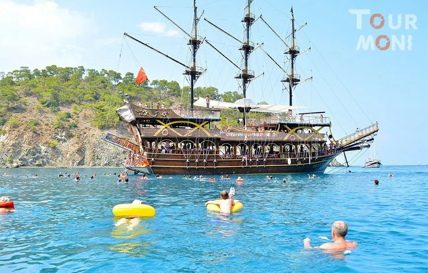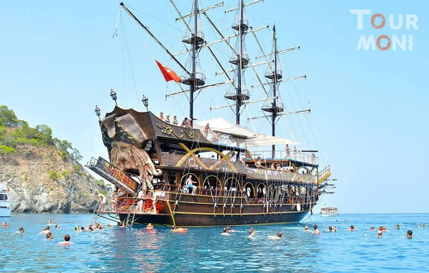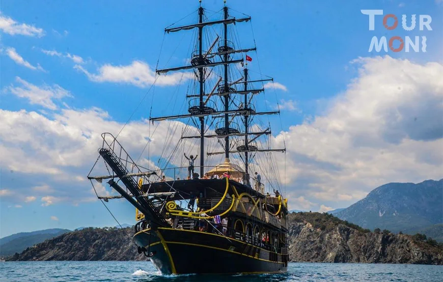 Die Reise beginnt am Morgen, wenn ein komfortables Auto Sie von Ihrem Hotel in Antalya abholt und zum Hafen von Kemer bringt. Die Fahrt dauert etwa eine Stunde. Wenn Sie ankommen, werden Sie von dem beeindruckenden Piratenschiff begeistert sein. Dieses Schiff mit mehreren Decks ist vollständig ausgestattet mit Toiletten, bequemen Lounges, Sonnenliegen, Bars und einem hochmodernen Soundsystem, alles entworfen, um Ihnen ein angenehmes und freudvolles Erlebnis zu bieten.