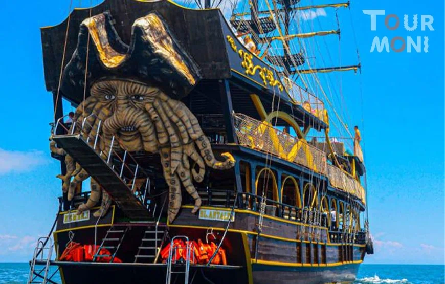 Unsere tägliche Antalya Piratenboot-Tour beginnt morgens und beinhaltet einen Abholservice von Ihrem Hotel. Unser Team wird Sie zum Hafen fahren, wo Sie ein beeindruckendes Piratenboot besteigen werden. Das Boot ist mit mehreren Decks und allen notwendigen Annehmlichkeiten für eine komfortable und angenehme Reise ausgestattet. Sie können sich auf den speziell dafür entworfenen Bereichen entspannen und die Sonne genießen oder im Diskobereich den Tag durchtanzen.